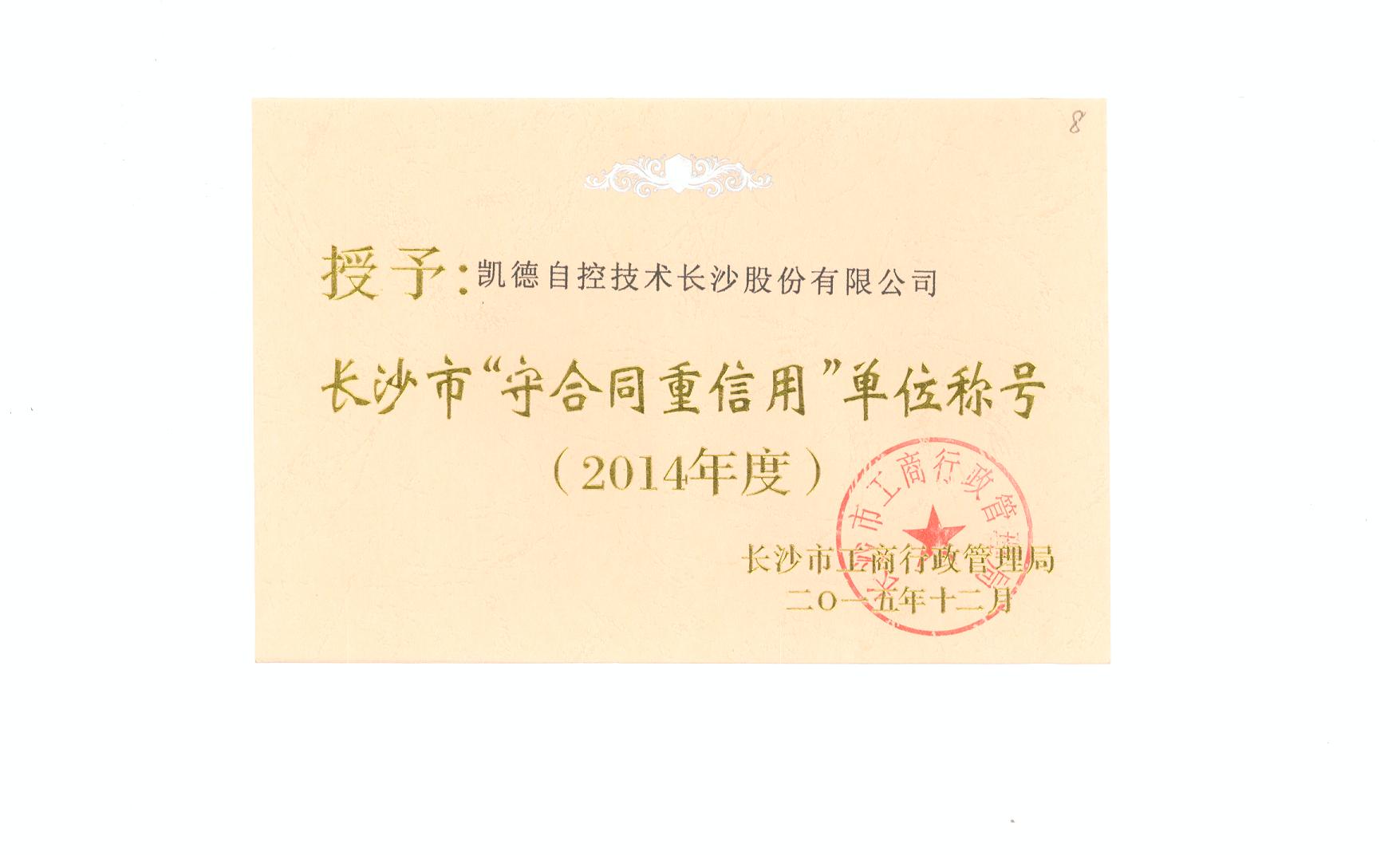 2015年,我公司繼續(xù)榮獲長(zhǎng)沙市2014年度“守合同重信用”榮譽(yù)稱號(hào),公司自創(chuàng)建以來,年年獲得此項(xiàng)榮譽(yù)。公司始終堅(jiān)守“誠(chéng)實(shí)做人、誠(chéng)實(shí)做事”的宗旨,為顧客提供“滿意”是“凱德人”的做事原則,“守合同、重信用”贏得了廣大合作單位的信任和支持。